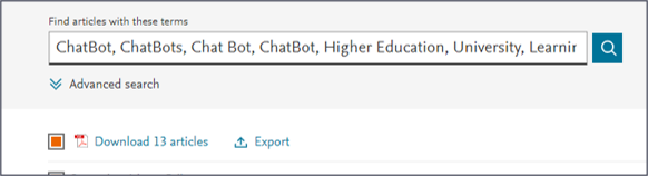 https://www.sciencedirect.com/search?qs=%28Chatbot%20OR%20ChatBots%20OR%20Chat%20Bot%20OR%20Chat%20Bots%29%20AND%20Learning%20AND%20%28Higher%20Education%20OR%20Adult%20Education%20OR%20Adults%29&years=2023%2C2022%2C2021%2C2020%2C2019&articleTypes=REV&show=100&lastSelectedFacet=publicationTitles&subs=true