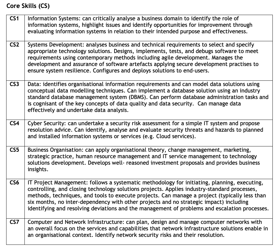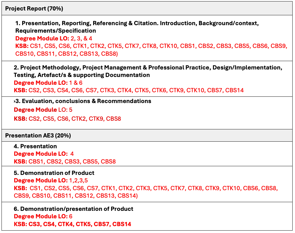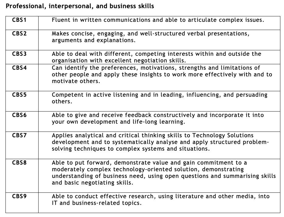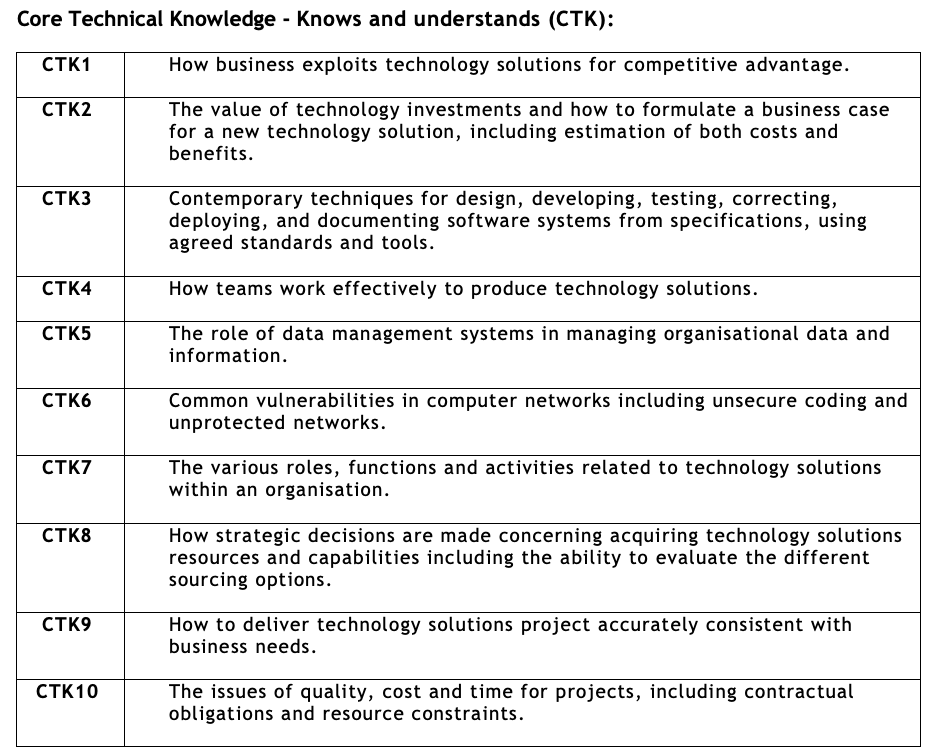 Apprentices on the Digital and Technology Solutions apprenticeship will also complete a mapping matrix that outlines learning across all credited modules, including assessed work-based learning. This matrix (not directly assessed) provides assurance that the apprentice has achieved broad coverage of the KSBs defined in the apprenticeship standard.