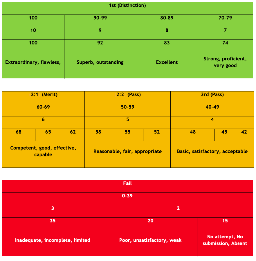 At Solent University, assessments are marked using a numeric grading system. Individual assessments use “stepped” grading, as shown below: