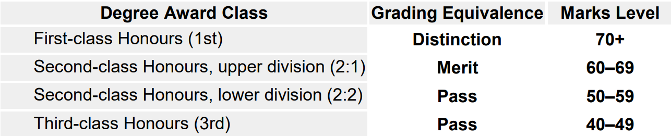 The national degree award outcomes are shown below with apprenticeship grading equivalence. These typically are as follows: